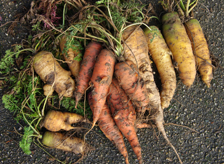 Curieusement les carottes jaunes ont été classé "fourragères" jusqu'à ces dernières années. Je l'avais essayé (la variété 'Jaune Obtuse du Doubs' se trouve en graines à un modique dans toute les graineteries) il y a bien longtemps, très sympa, bonne productivité, vigoureuse, rien à envier à une "potagères", un goût un peu plus doux, peut être. Maintenant les catalogues professionnels proposent des sélections (hybride F1 entre autre) à un prix exhorbitant,. D'autre couleur pourrait apparaître sur le marché, blanches (peut être, commercialement la couleur n'est pas idéale) violette. LA couleur rouge de la carotte est récente, il me semble que jusqu'au XVIII ième, les carotte étaient bla