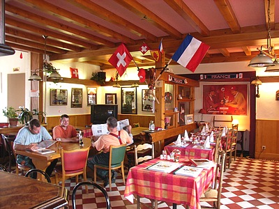 Le batiment est depuis devenu un hôtel... Le seul au monde a être sur une frontière ; de ce fait, il existe deux fois, "hôtel franco-suisse" côté suisse (deuxième photo), "hôtel Arbez" côté français, d'où la présence de deux entrées (la première côté français, la seconde côté suisse), et ne paie des taxes à chaque pays que pour le nombre de chambres qui se trouve du bon côté de la frontière. Dans le détail, ça vous donne la photo ci-dessous (la salle à manger), et une chambre où la frontière passe au milieu du lit !