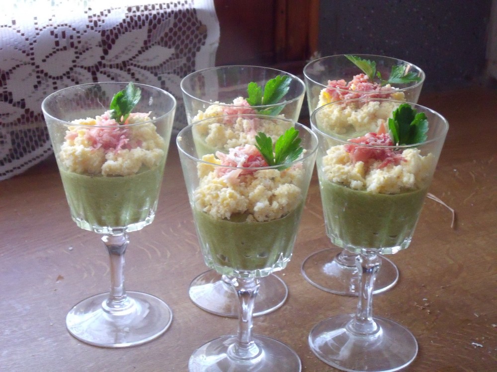 - Dans chaque verre, déposer quelques cuillerées de la crème d'asperges (sur 2-3 cm), puis émietter un peu d’œufs mimosa (sur 1-2 cm) (saler, poivrer). Décorer le dessus avec quelques miettes de jambon serrano et un brin de persil.
