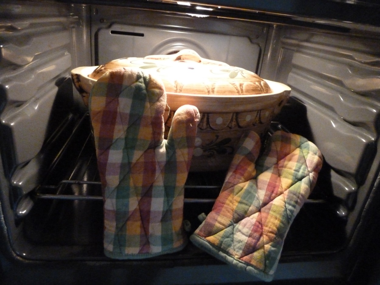 En fin, bien mouiller avec le vin blanc (toute la bouteille) Une fois le four préchauffé, enfourner à 200° pendant 1heure puis 180° 1heure et demi