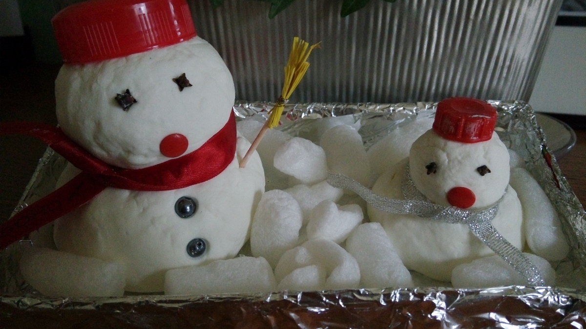 Le bonhomme de neige c'est un essai pas très concluant à base de maïzena, bicarbonate et mousse à raser. Non, ce n'est pas comestible malgré le petit goût de girofle ;)