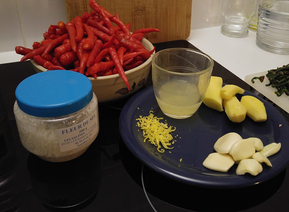 Toujours sur la base de ce qu'a donné Joey... Mais pour la quantité j'ai adapté un peu les doses (presque 390 grammes de piments, de cayenne toujours) : 5 gousses d'ail, +/- 80gr de gingembre (en fait ce qui restait après la Krupnikas :p), du zeste de citron + le jus d'une moitié, fleur de sel au pif, 5 cs huile d'olive et même quantité de vinaigre.