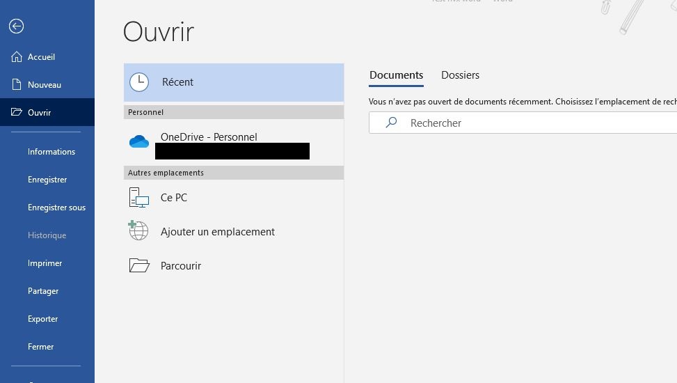 arkayn wrote: 25 Aug 2019 19:32 Je n'ai pas 2020, mais je pense que si tu vas dans Fichier > Options, puis que dans le volet gauche tu sélectionnes Options avancées, il te suffit de mettre à 0 le nombre de fichiers récents (dans Afficher) (peut-être aussi dans Afficher ce nombre de dossiers non rattachés). Dès lors, il ne proposera plus tes fichiers récents mais uniquement le dernier emplacement utilisé, à savoir Mes documents.