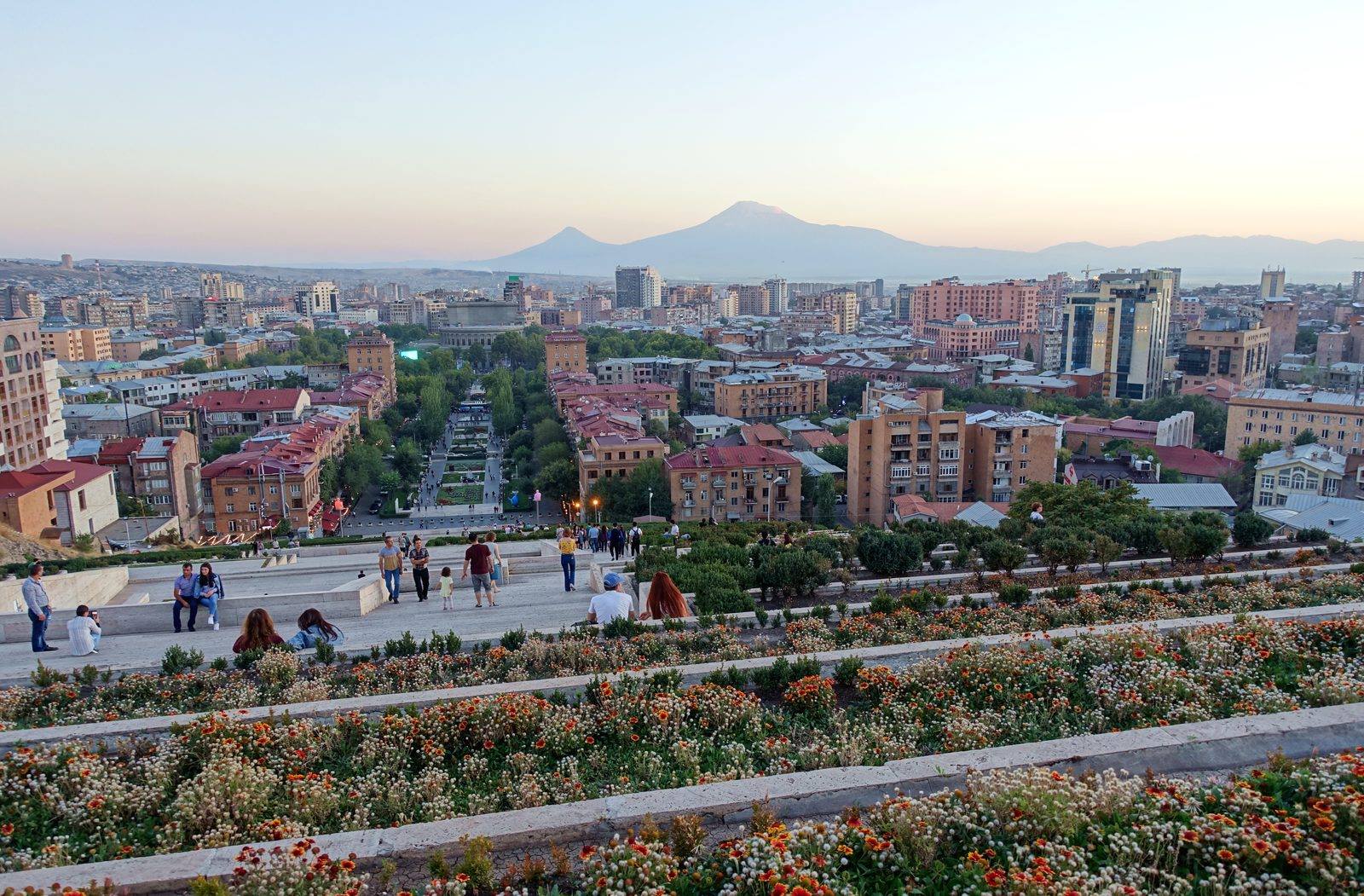 Depuis le haut de la Cascade le coucher de soleil sur la ville et le mont Ararat, la montagne sacrée des arméniens, est magnifique.