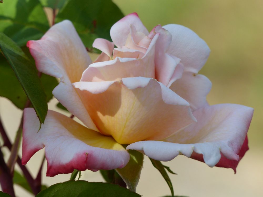 La rose jaunit rien qu'à l'idée de devoir s'ouvrir et semble ici bien hésiter: