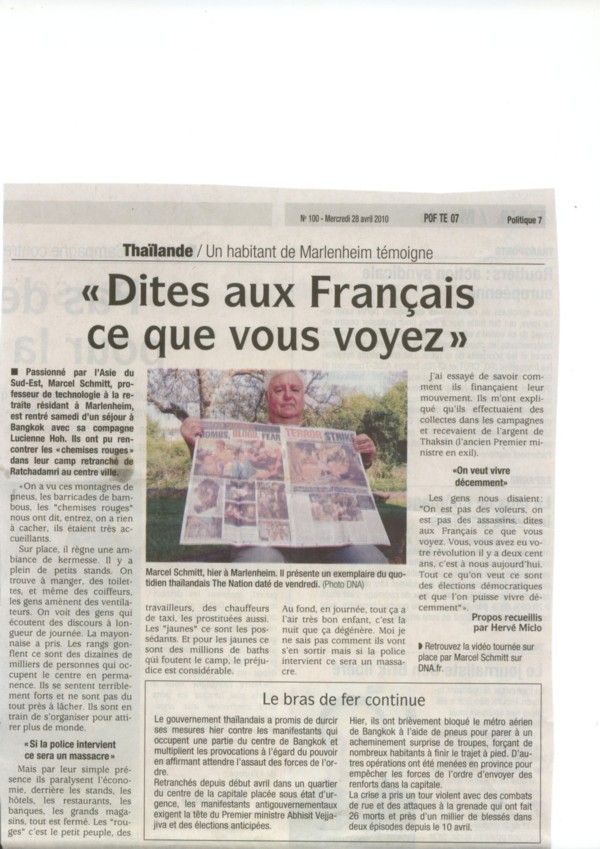 C'est l'inverse, pour schématiser les rouges sont plutôt issus des classes pauvres du nord, tandis que les jaunes se trouvent plutôt parmi les classes moyennes/hautes de Bangkok, ou au sud. Mais j'avoue que c'est compliqué, il y a même d'autres couleurs qui viennent s'en mêler, dont les "multicolores", qui seraient en fait plutôt proches des jaunes, les blancs qui seraient pour la paix, les bleux, les marrons... Moi j'ai hâte qu'on en finisse avec ce bin's, parce que je ne sais plus comment m'habiller le matin !leo wrote:si j'ai bien compris, les "jaunes" sont de classe assez pauvre, les "rouges" plutôt nantis