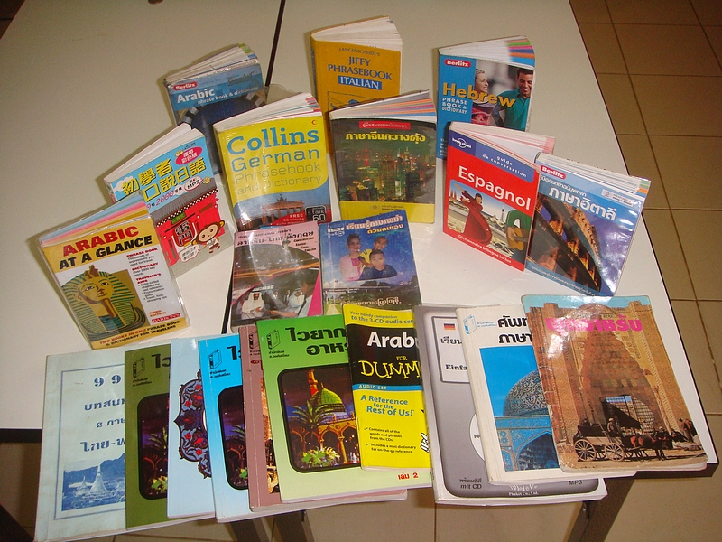 Par contre ici j'ai un amateur de livres pour apprendre les langues, particulièrement les petits formats qu'il peut sortir à tout moment de sa poche. Voici donc une partie des livres de John, une collection très freelanguienne.