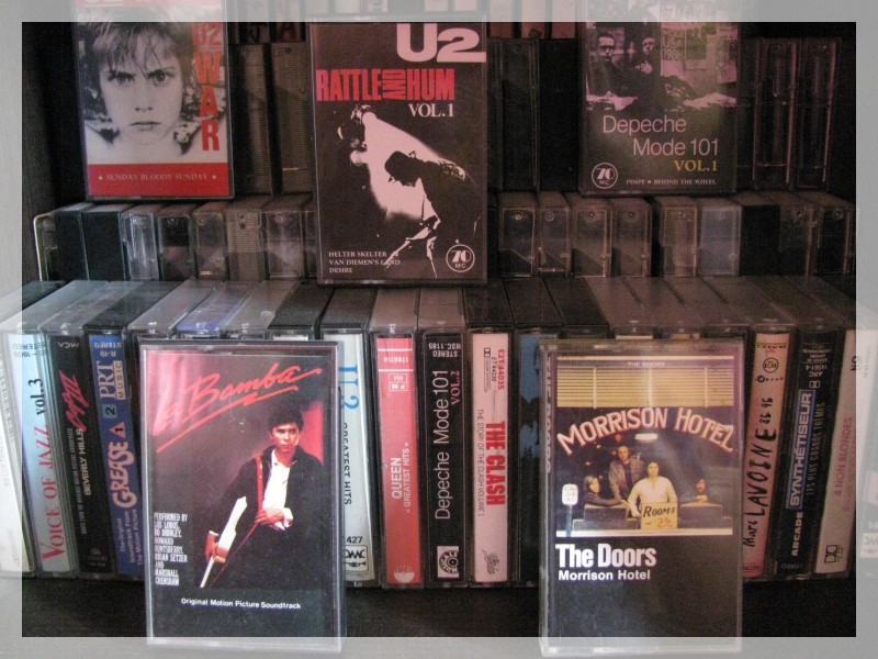 Voici un aperçu de ma collection de cassettes. Fatalement un jour mes enfants me demanderont ce que c'est, et je devrai leur expliquer qu'à l'époque où les MP3 n'existaient pas et où le seul son qui sortait d'un PC était le bip d'erreur, on enregistrait nos 45 tours (Papa c'est quoi un 45 tour ?) sur des cassettes qu'on se passait dans un walkman (Papa...). On en connaissait le contenu par coeur, et même encore aujourd'hui, si j'entends à la radio ou ailleurs une chanson qui figurait sur l'une de mes cassettes cultes, j'ai ensuite l'air de la chanson suivante sur la cassette qui me rentre automatiquement dans la tête.