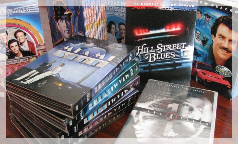 Hors concours, je vous présente aussi ma collection de DVD de séries qui étaient diffusées dans les années 80. J'ai hésité entre les deux photos, mais dans le cas des DVD la valeur sentimentale est attachée uniquement au contenu et pas du tout à l'objet. J'ai même quasiment horreur des DVD, c'est fragile, pénible à manipuler, extrêmement lent à charger... En revanche, que de bon temps passé à regarder ces séries qui pour certaines n'ont pas pris une ride (enfin pas plus que nous !).