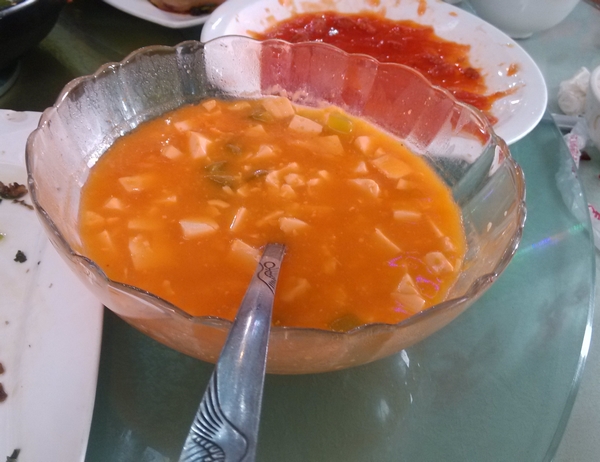 Hors concours, la soupe de soja à l'orange. Le seul plat qui est resté presque intact sur la table ce midi... La honte, c'est moi qui l'avais commandé, sur la photo ça ressemblait à un autre plat de tofu que j'avais bien aimé une fois.