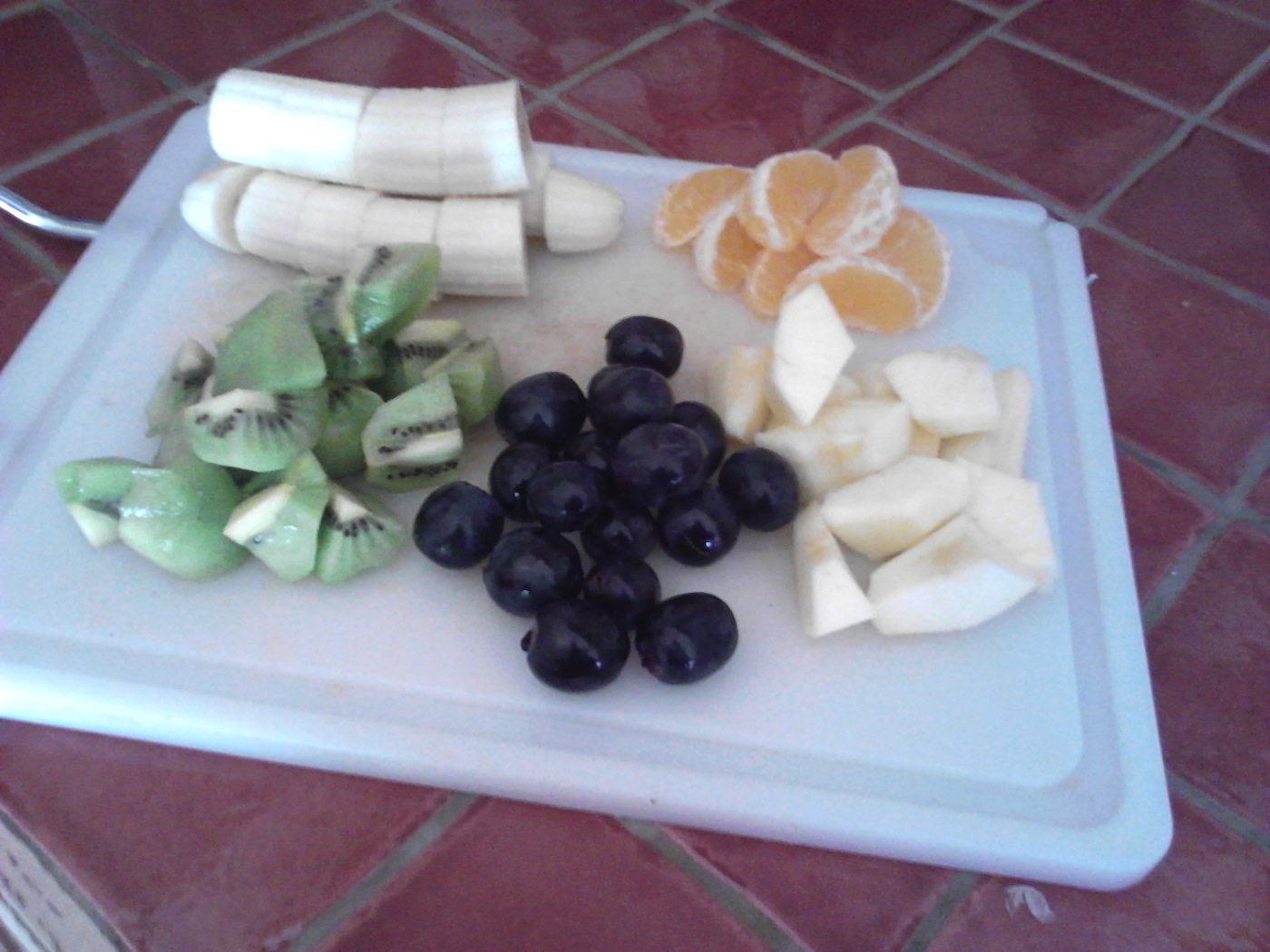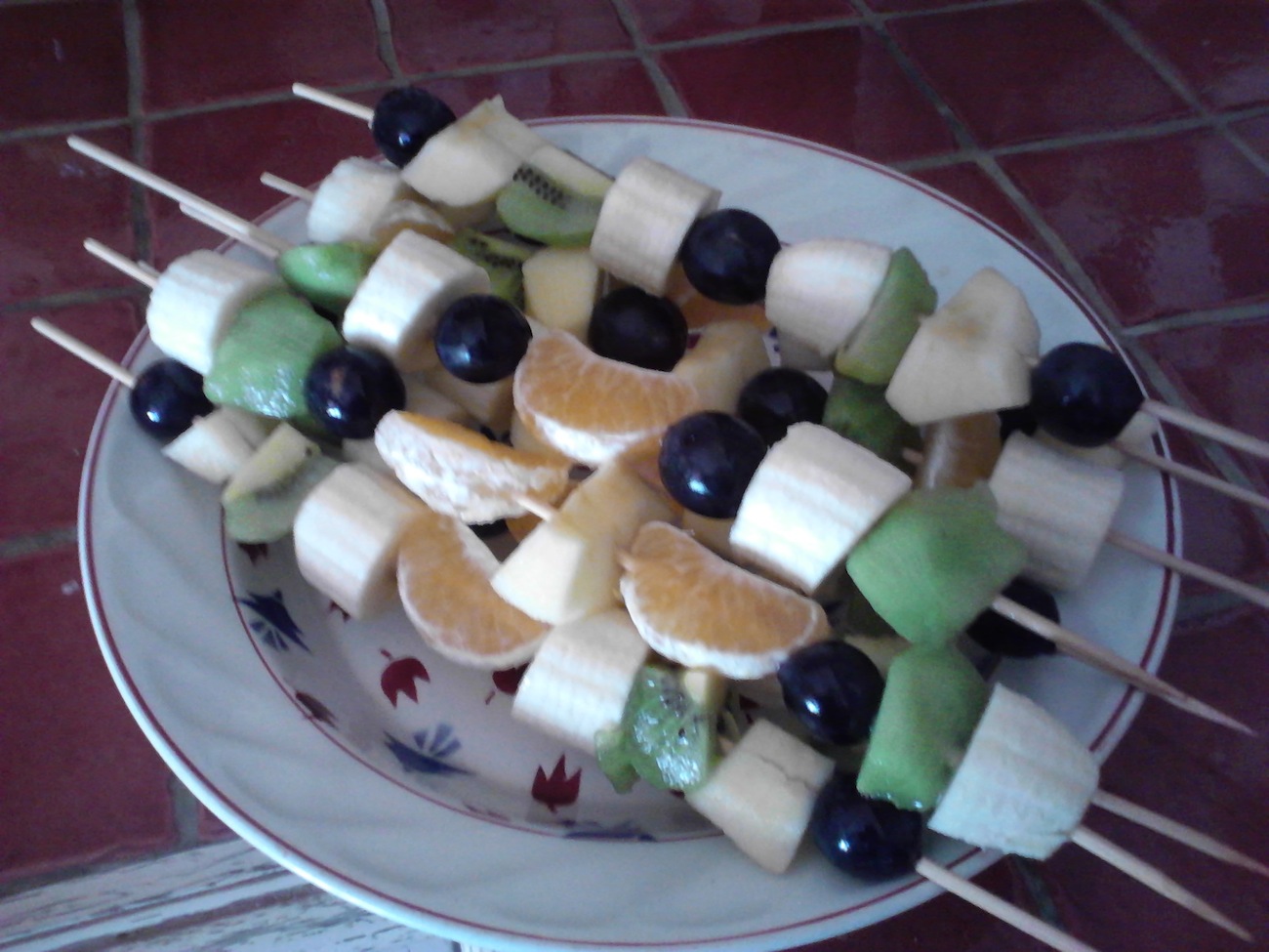 - Peler et couper tous les fruits en dés ou rondelles grossiers (il ne faut pas qu'ils soient trop petits sinon ils se cassent quand on les enfile sur les piques à brochette)