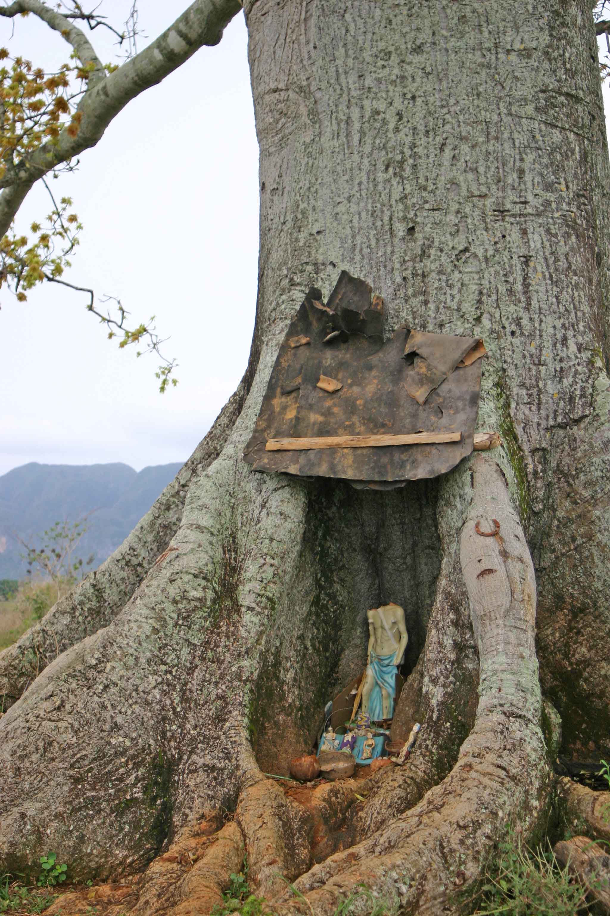 Voici un arbre que devant lequel je suis passé au cours d'une rando dans la province de Vinalès à Cuba où comme vous le savez la religion catholique est souvent accommodé à la sauce locale notamment avec la santeria. J'ai choisi ce cliché pour l'originalité. Nous étions en pleine campagne à des kilomètres de toutes habitations au milieu des cultures de tabacs.