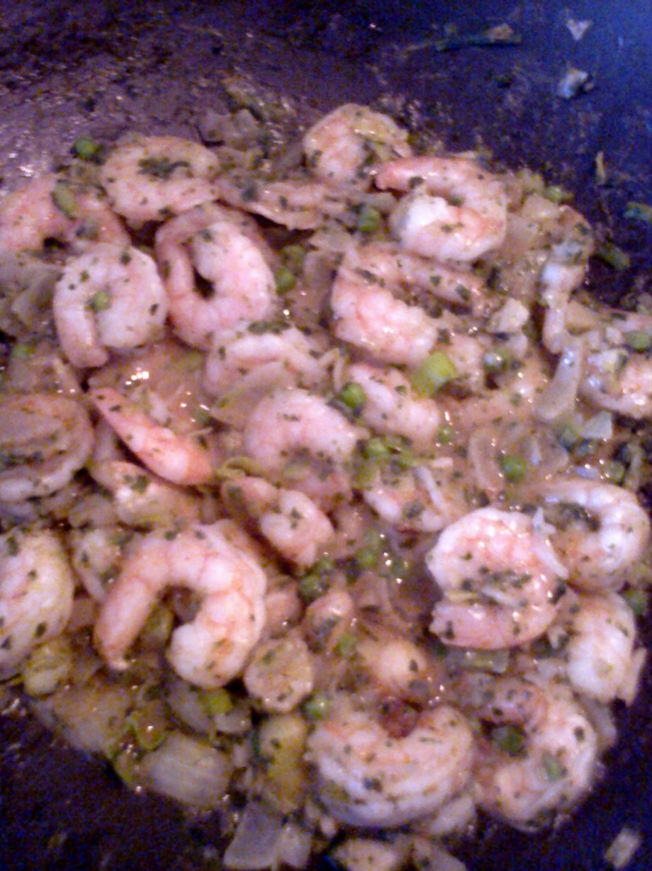 Ajouter les crevettes...laisser sur le feu le temps que les crevettes soient cuites (5 à 7 min pas plus)