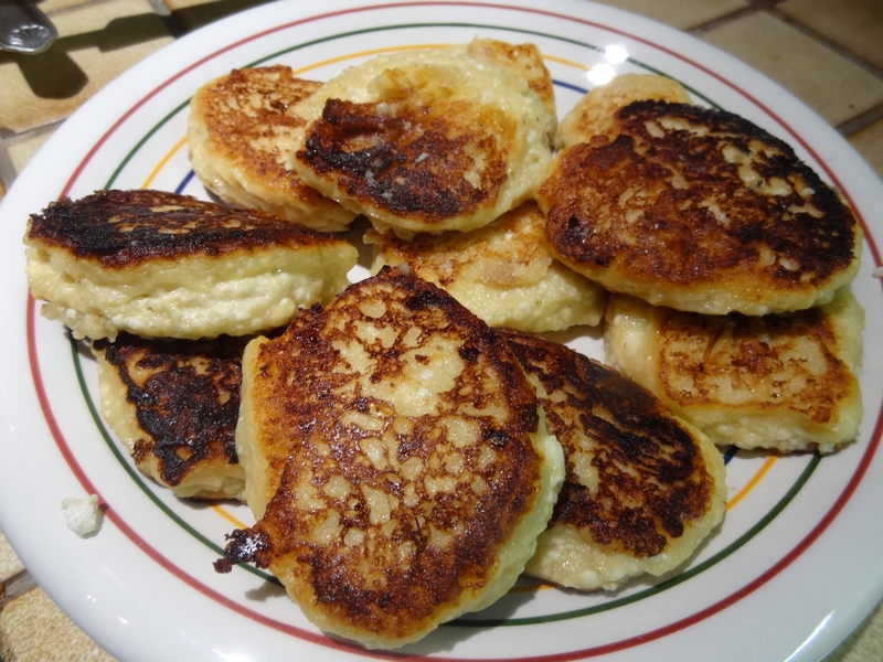 Je ne crois pas vous avoir déjà donné la recette des sirniki, même si j'en avais parlé sur une recette équivalente mais salée. La seule difficulté, c'est de trouver (ou de faire) du fromage à la bonne consistance. Le tvorog est un fromage blanc très égoutté, de consistance presque solide (s'effrite). Vous pouvez soit utiliser du vrai tvorog si vous en trouvez, soit un pseudo-équivalent genre ricotta (mais personnellement je trouve que ça ne fait pas du tout l'affaire), soit faire égoutter du fromage blanc en faisselle jusqu'à obtenir la même consistance, soit encore utiliser du fromage frais, mais le souci à ce niveau-là, c'est que le fromage est salé et nous préparons ici un plat sucré, donc je ne sais pas dans quelle mesure ça passe au goût...