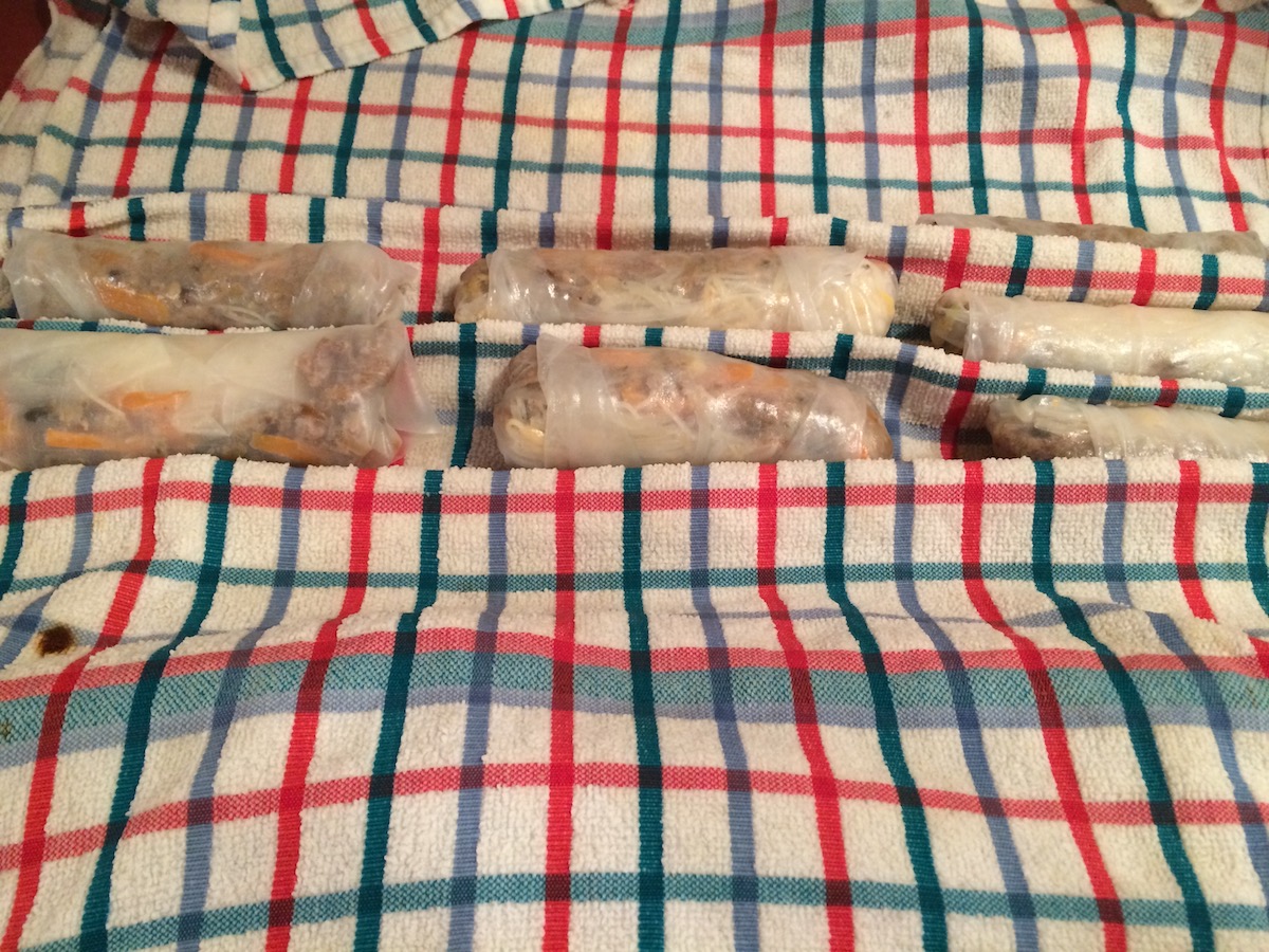 3. Pour la garniture des feuilles de riz, il faut d'abord les faire tremper dans l'eau bouillante une par une (elles sont vendues sèches, comme les vermicelles) avant de les garnir tour à tour avec le mélange de viande précuit, carottes râpées et vermicelles de riz. Le pliage est un peu délicat (on trouve des vidéos sur le net.) Réserver chaque nem une fois garni sur un torchon humide.