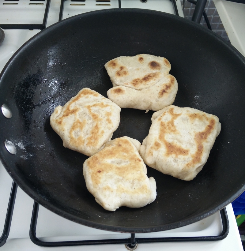 Ensuite, faire chauffer de l'huile dans une poêle et verser dedans la pâte en petites galettes assez épaisses. Personnellement, j'avais gardé ma pâte assez collante donc j'ai formé des quenelles avec deux cuillères, puis je les ai aplaties légèrement. Je pense qu'on peut aussi mettre plus de farine (ce qui rendra le tout plus consistant) et former des boulettes à la main.