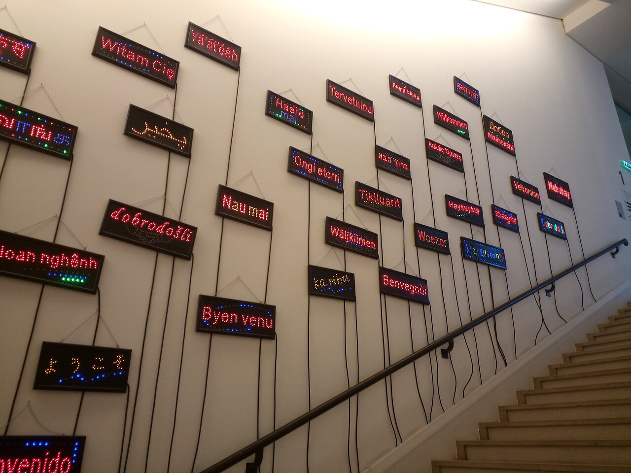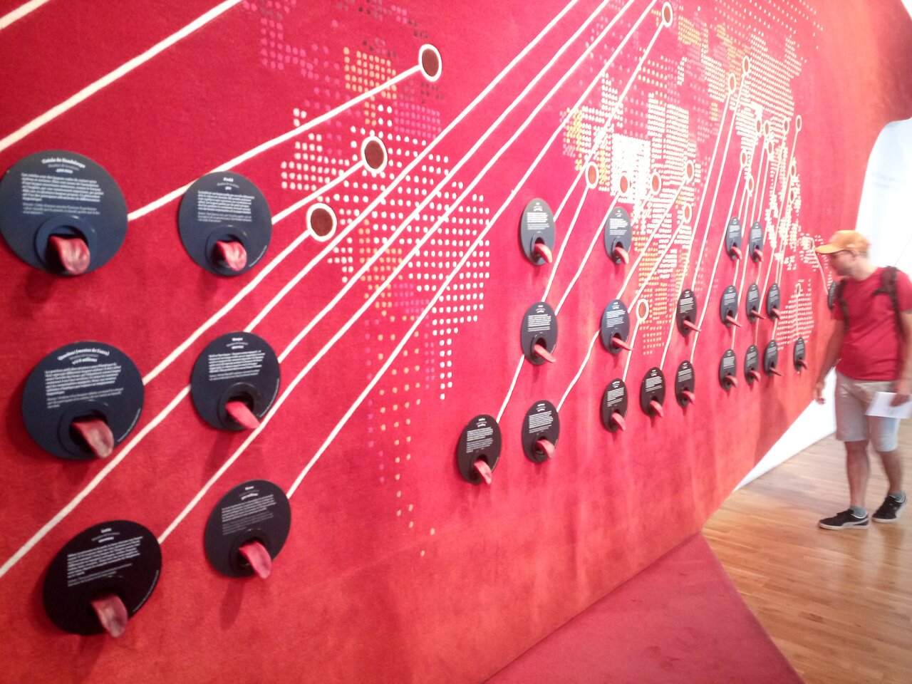 "Bienvenue" au musée de l'Homme à Paris : Mur de langues (on tire sur une langue pour écouter un locuteur s'exprimer dans une langue) :