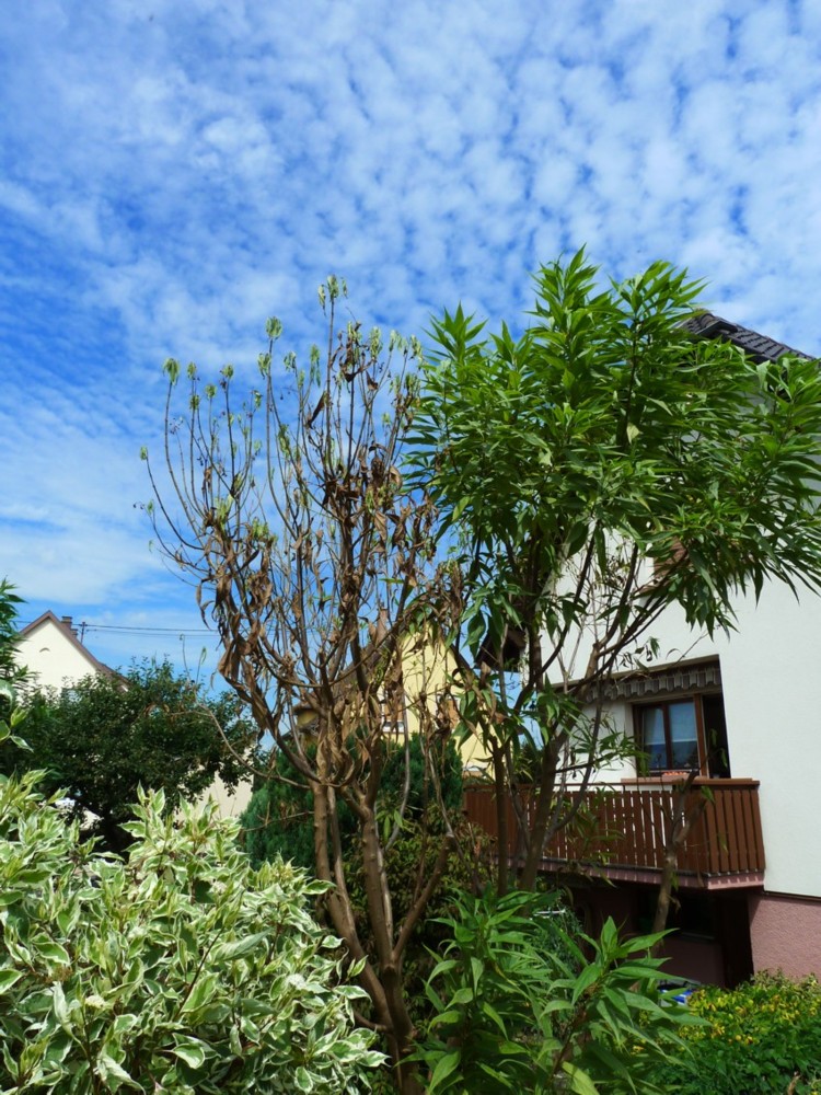 qu'est ce qu'il lui arrive ? c'est un arbre moyen 3à4m à maturité (je n'en sais plus le nom) qui fait de belles fleurs blanc/violet de Mai à Juillet, là il a l'air de dessecher (il m'en avait déjà fait un début l'année dernière), pourtant son copain planté à 5m se porte comme un charme...