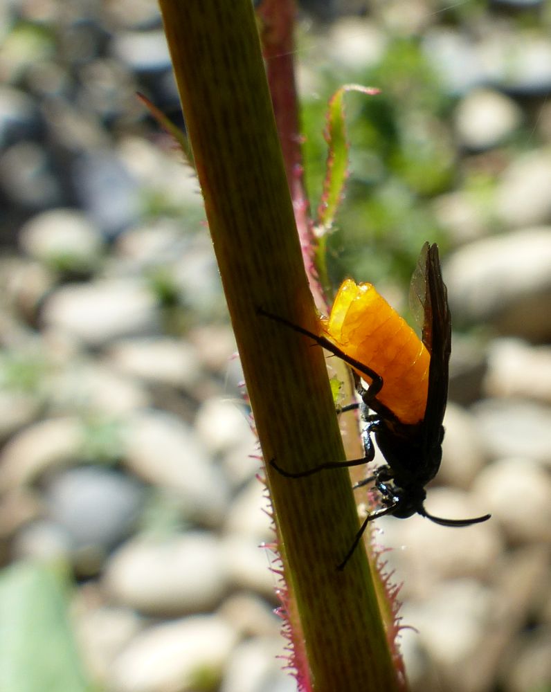 Il s'agit de la mouche à scie villageoise et, telle que vous la voyez sur la photo, elle pond tranquillement dans la tige de mon rosier anglais dernier arrivé! :evil: