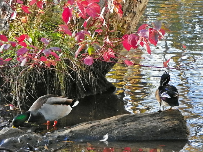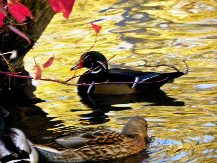 J'avais posté au Club des Noctambules et ici des photos d'automne où on voyait des plantes. Pas loin de chez moi il y a le Parc de l'Anse-Bleue (dont j'ai déjà parlé dans plusieurs posts) et, dans ce parc, un lac. Artificiel mais il contient de la vraie eau. De sorte qu'il attire des vrais canards. De sorte que je m'y suis retrouvé avec ma caméra... Suivant la recommandation de Lat, je vous les offre ici (plutôt qu'au Club des Noctambules même si ici, en ce moment, on est en pleine nuit) quoique je ne peux pas sincèrement appeler ça "mes créations perso". En effet, bien que certaines de ces photos soient fort belles, je ne m'en sens pas le mérite car ce ne sont pas "mes" créations : l'image était là, tout ce que j'ai eu à faire fut "point and shoot". Ce sont les créations de Mère Nature qui sont fort belles : moi je n'ai que cliqué.