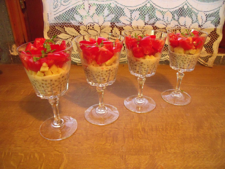 - Dresser dans des grands verres : d'abord une couche de lentilles, puis une couche de comté, terminer par les tomates.