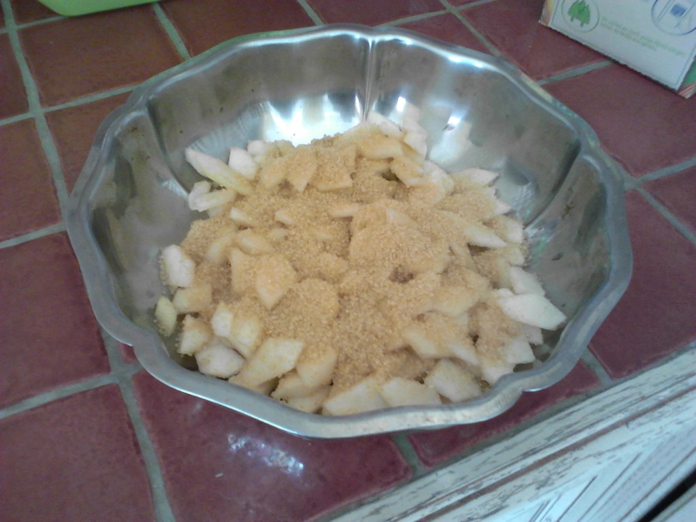 Dans un saladier, mettre les poires épluchées et coupées en petits morceaux, avec la moitié du sucre roux. Bien mélanger puis laisser reposer pendant la préparation de la crème. Si les poires ne rendent pas assez de jus, ajouter un peu de jus de fruit ou d'eau.
