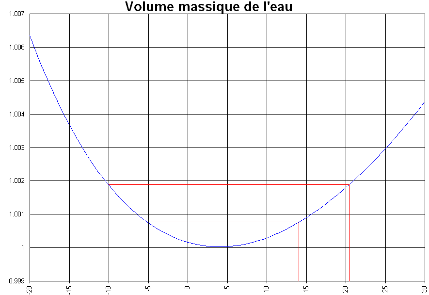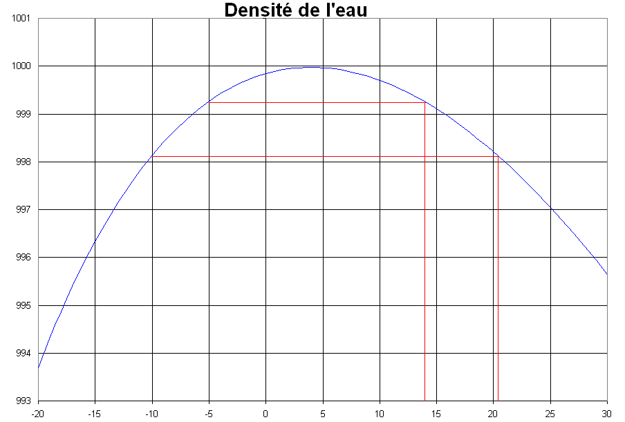Bin non... D'ailleurs pas besoin de profs, d'une école avec son amicale et d'un frigo défectueux : tu peux en faire autant dans ta cuisine. Mais justement, ça ne marchera pas très bien. Les densités apparaissant sur les graphiques sont pour de l'eau, pas pour un mélange eau-air. Or il est assez difficile de faire de la glace sans air. (Les glaçons pour l'expérience mentionnée dans mon post précédent étaient faits à partir d'eau fraîchement distillée. Le moule à glaçons était fermé, hermétique et élastique (des "balounes", quoi), pour que le moins d'air possible puisse s'infiltrer.) Dans l'eau liquide usuelle (comme celle du robinet) il y a de l'air en solution : les molécules de cet air viennent s'intercaler entre les molécules d'eau dont la densité varie peu. Oui : de l'eau avec de l'air en solution aura une densité UN PEU moindre que 1, mais très très peu. Par contre, la glace ne dissout pas l'air (oui un peu mais c'est négligeable). Alors l'air en solution dans l'eau reprend sa forme gazeuse sous forme de petites bulles quand l'eau se solidifie. Alors forcément, la densité diminue de façon appréciable (car le volume augmente de façon appréciable).