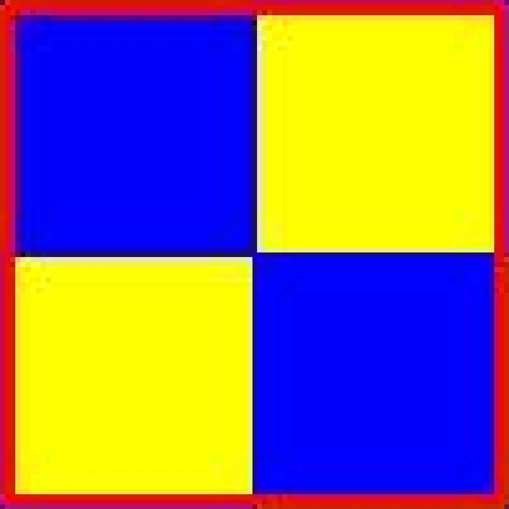 Pour dessiner cette image je n'ai utilisé que trois couleurs : du bleu pour les lignes séparatrices et pour les carrés bleus, du jaune pour les carrés jaunes et du rouge expliqué ci-dessous.