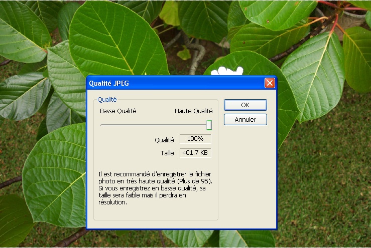 Si je veux l'enregistrer JPEG (je n'ai pas le choix sinon je ne pourrais pas la mettre ici), mon logiciel (Photoscape) me demande quelle qualité je désire.