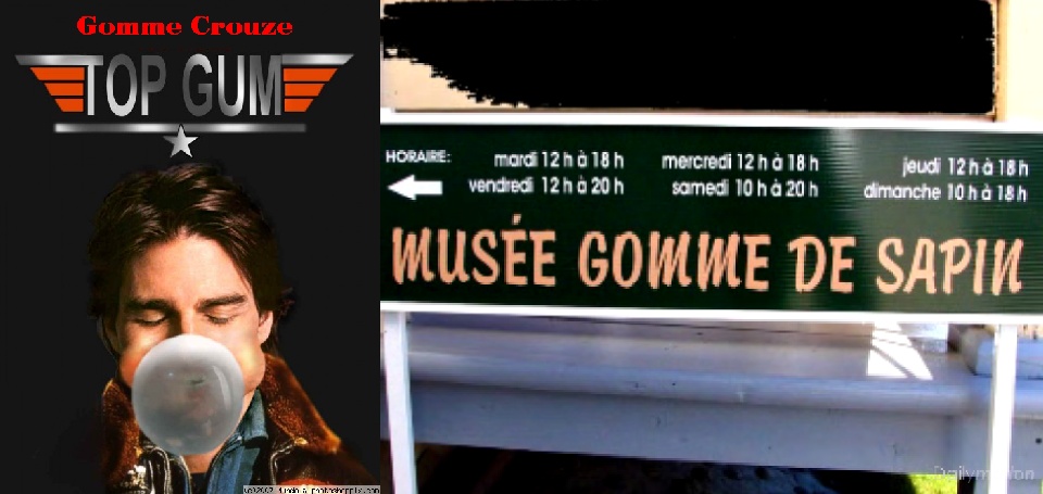 Deuxième question : Où, mais où est-ce que peut-on trouver un musée de la gomme de sapin ouvert le midi? Hein? Hein? Attention : il ne s'agit pas de vous passer un sapin ni de rester gommés à vos vieilles habitudes : on ne parle pas de gomme à effacer, pas de gomme à mâcher, pas de Gomorrhe, pas de gum shoes, pas de gommaccio ni de Top Gum (avec Gomme Crouze) mais bien de gomme de sapin! Et attention : ce musée doit être ouvert le midi. Car je présume que, le soir, vous devez avoir mieux à faire que d'admirer de la splendide gomme de sapin, non? (enfin, si vous n'êtes pas célibataire...)