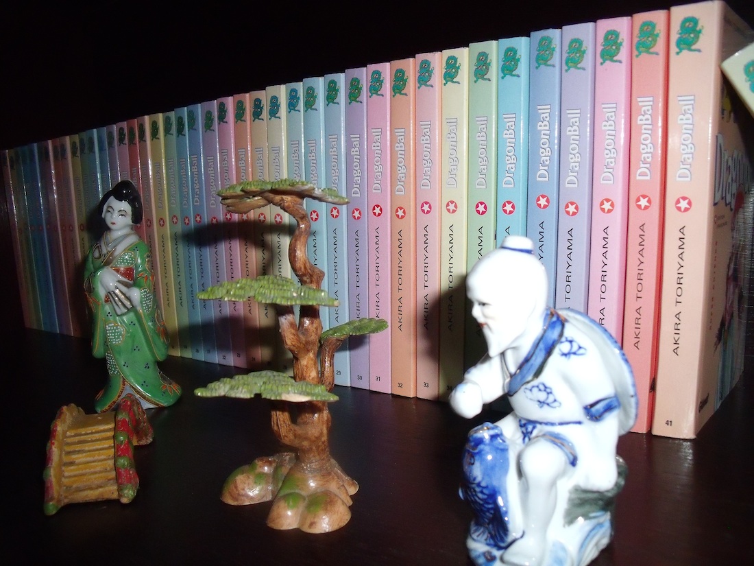 Il s'agit de la collection des BD de Dragon Ball de M. Isis, qui se trouve dans une vitrine, agrémentée de bibelots au parfum d'Asie. J'ajoute que je n'ai rien touché pour la photo : tout se trouvait déjà tel quel.