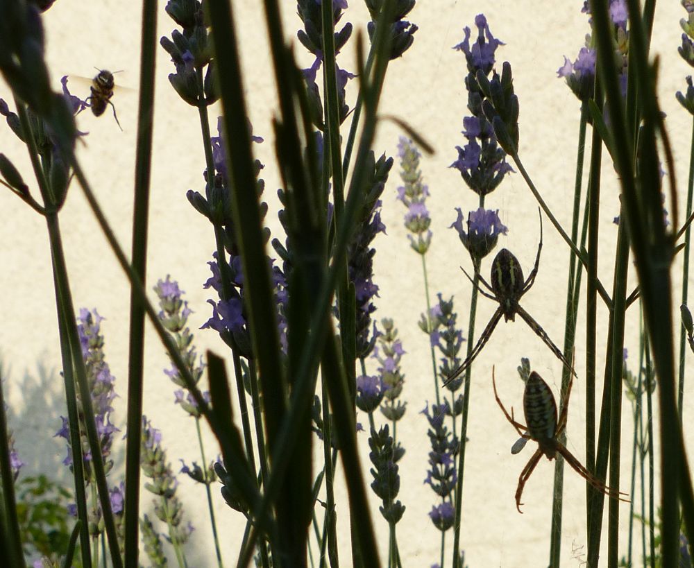 Point d'argiope en vue dans mon carré de verdure (enfin, plutôt sèche, l'herbe). Les rosiers accueillent en général une araignée crabe (la Thomise). Petite mais impressionnante à observer...