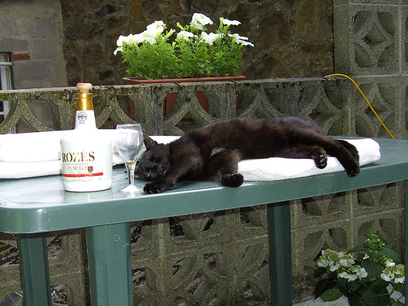 Tu es observateur, cher sis, mais ce n'est pas tout à fait ça : le blanc, c'était le chien ! Pas très grand en effet, mais quand même plus qu'un chat, c'était un spitz je crois. D'où la niche. Donc en fait c'est ça l'histoire : le vendeur nous a proposé la chienne, qui était gentille tout plein, mais on voulait pas de chien. Donc, il l'a donnée, et je suppose qu'il a pensé qu'il réussirait pas à donner une vieille chatte et je pense que c'est pour ça qu'il nous a filoutés sur la chatte (alors qu'en réalité on aurait dit oui, mais bon...)