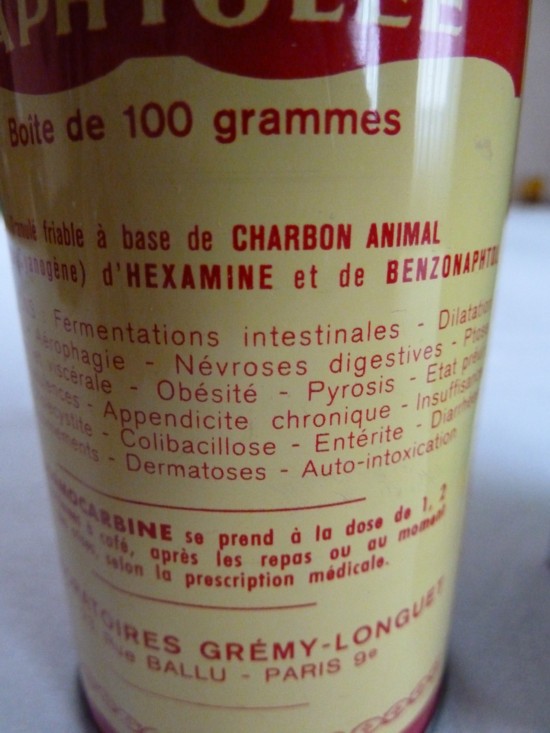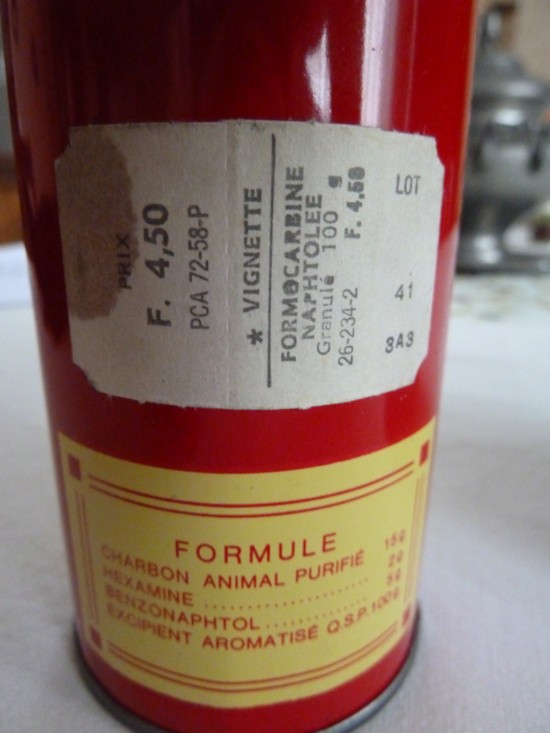 la version de mon enfance était naphtolée (interdit aujourd'hui, soupcons d'être cancérogène), vous remarquerez la différence de prescription avant/après :) et le prix, en 70 c'était déjà pas donné... mais il y avait la boite en inox, aujourd'hui c'est du carton ! (pour la contenance, c'est la même malgrès les apparences)