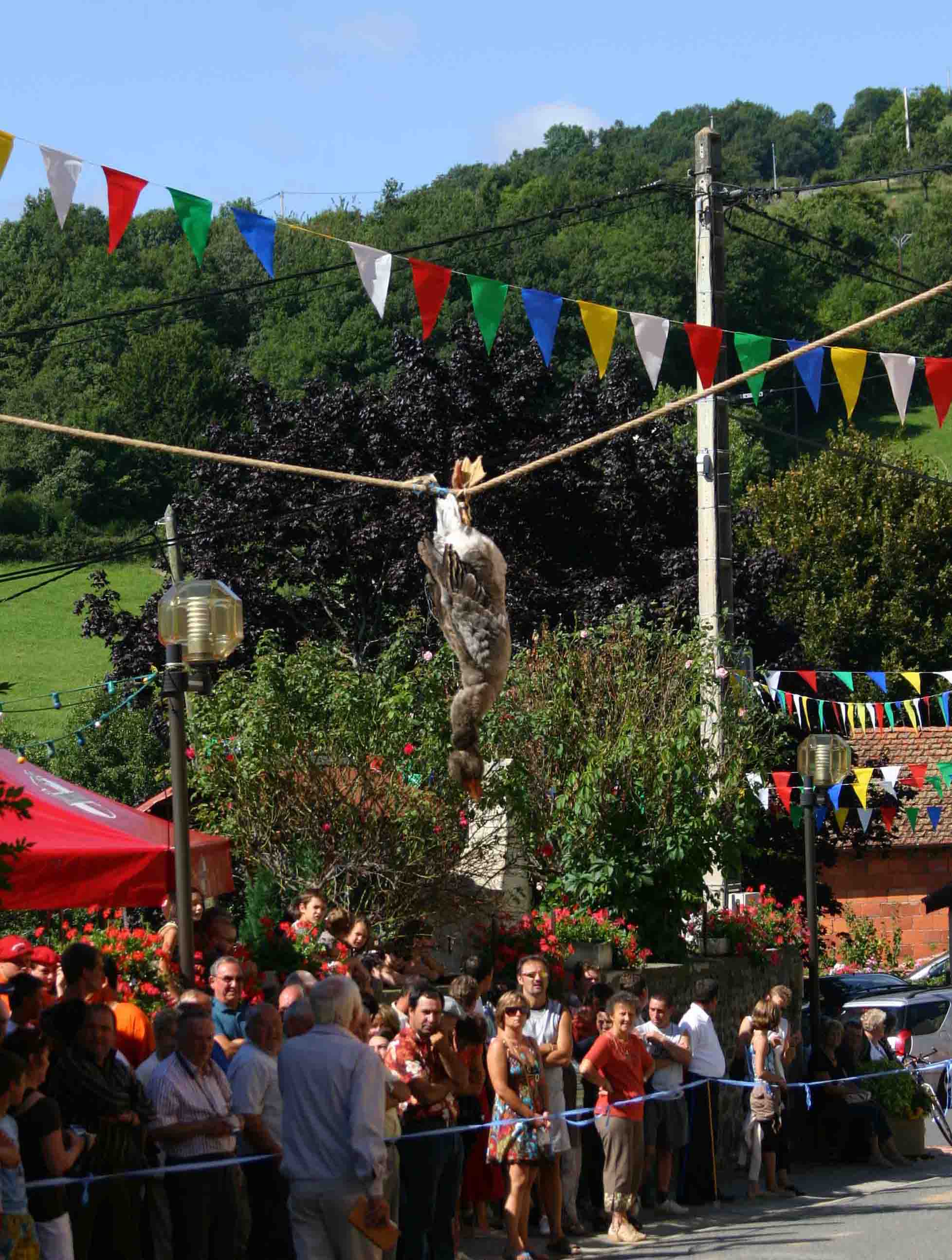 Le volatile que vous voyez, est pendu par les pattes sur une corde tendue au dessus de la rue principale du village de part et d'autre du 1er étage de deux maisons. Les jeunes du village montés sur des chevaux passent à la queue leu leu sous la corde et au cours de multiples aller et retour, tente d'arracher la tête de l'oie. Celui qui y parvient gagne l'oie.