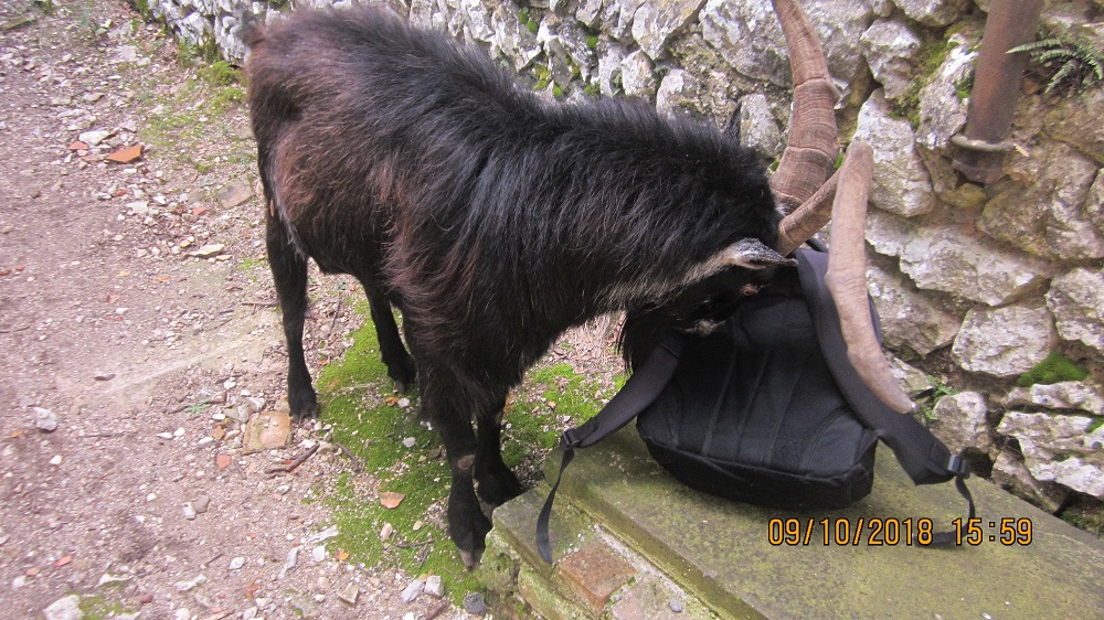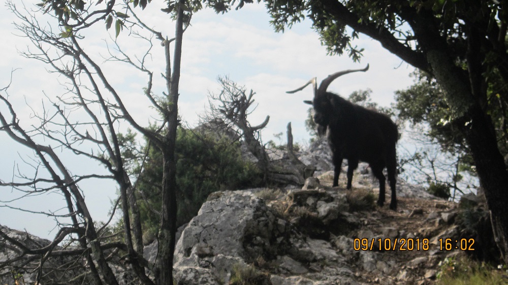 Ce bouc (j'ai encore son odeur sur mon sac à dos qu'il avait farfouillé sans vergogne et contre lequel il s'était frotté, sans parler de ma chemise et de mon pantalon) semblait être le gardien à la fois de sa femelle et de son territoire près d'une chapelle abandonnée. Il m'a proprement viré "banu militari" (la bano = la corne, en provençal) en faisant usage de la contrainte par corps en me poussant de toute sa masse. Les longues cornes m'inspiraient un certain respect, d'autant plus que j'étais seul de chez seul, et une certaine crainte d'être poussé dans le précipice. Heureusement, à la limite de ce qui semblait être son territoire, l'animal a lâché prise en restant maître du terrain.