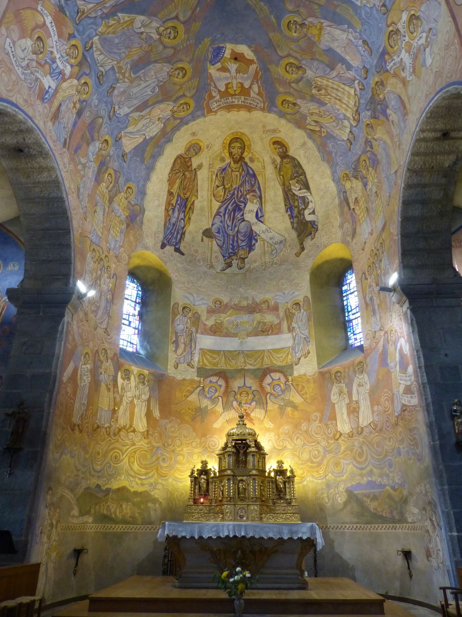 Sur la photo on pouvait reconnaître la "patte" de l'artiste estonien Nicolaï GRESCHNY qui a œuvré dans bon nombre d'églises d'Occitanie mais aussi ailleurs, comme ici à Châtel-Guyon où il réalisa sur invitation ce superbe travail, personnel et libre, lors du très piquant hiver 56 (et en dépit de ses contraintes), pire que l'hiver 54 déjà très rude; cette église est par ailleurs dotée non pas d 'étais (pour faire pendant à l'hiver