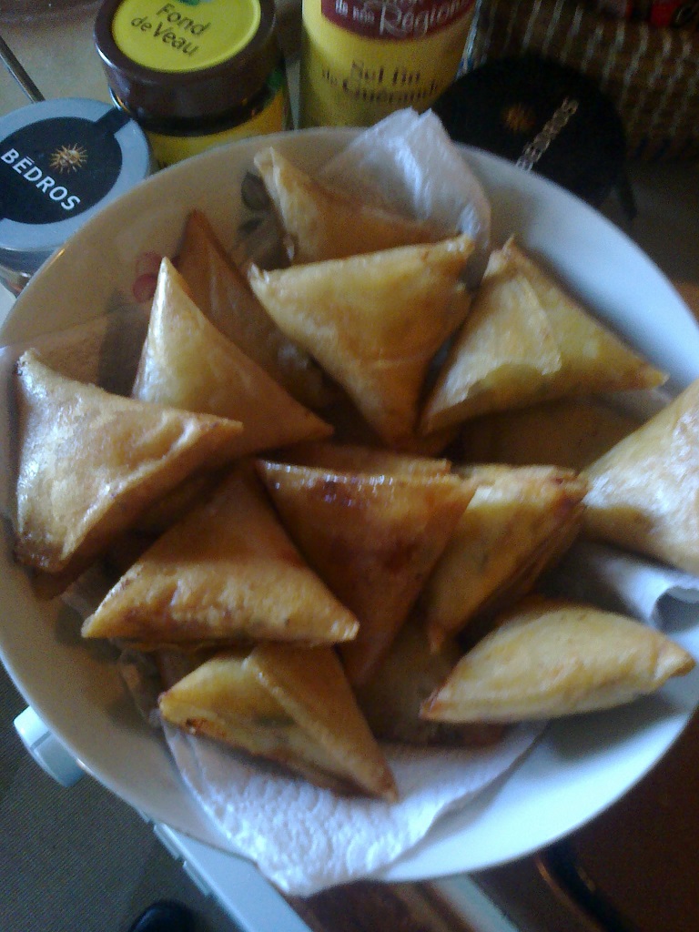 faire chauffer de l'huile dans une poêle, y glisser les triangles de samoussa, faire dorer de chaque côté...égoutter sur du papier absorbant et disposez dans un récipient en plastique...