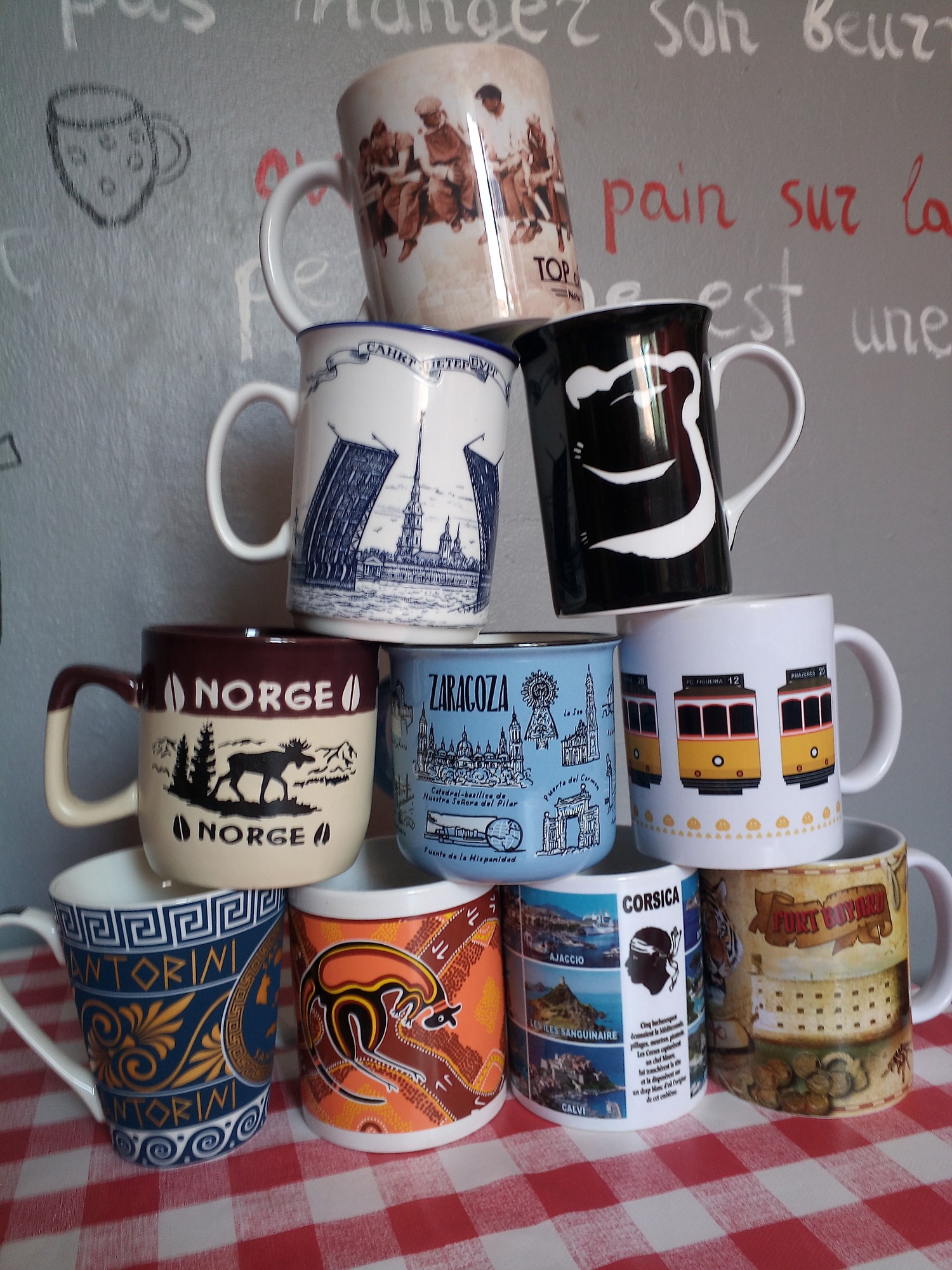 Mon truc perso c'est de ramener un "mug" de chacun de mes destinations de voyage. Voici un échantillon de ma collection :