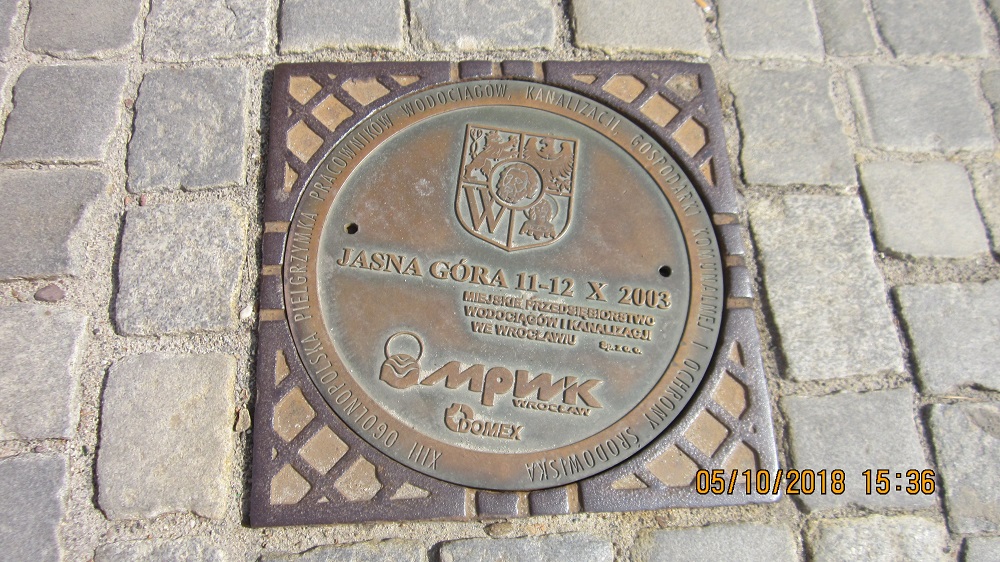 En plus d'être ferrovipathe, je suis aussi hyponomopomatophile, à savoir que je collectionne les plaques d'égout. Virtuellement, bien sûr. Ce sont des témoins de l'histoire de la ville, avec le blason, parfois l'ancienne dénomination avant le bouleversement des frontières et le déplacement des populations, et parfois lié à un événement précis, en l'occurrence, à Wroclaw, cette plaque en l'honneur du 13e pèlerinage national des travailleurs des entreprises des eaux et des services techniques communaux à Czestochowa (la Vierge noire). Dont acte :