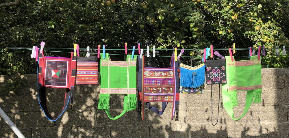 Quand on va en Thaïlande j'achète toujours 2 ou 3 petits sacs (le 2ème à gauche), c'est le format idéal pour mon téléphone, mes clés... Toujours le même modèle, dans le même magasin. Ainsi quand un est usé, j'en ai toujours un de rechange. Mais ma belle-mère et mes belles-soeurs aiment aussi nous offrir des sacs, nous commençons à en avoir une belle collection, très peu utilisée par contre. Ils ne sont pas tous sur la photo, comme nous venons de déménager je n'ai pas tout retrouvé.